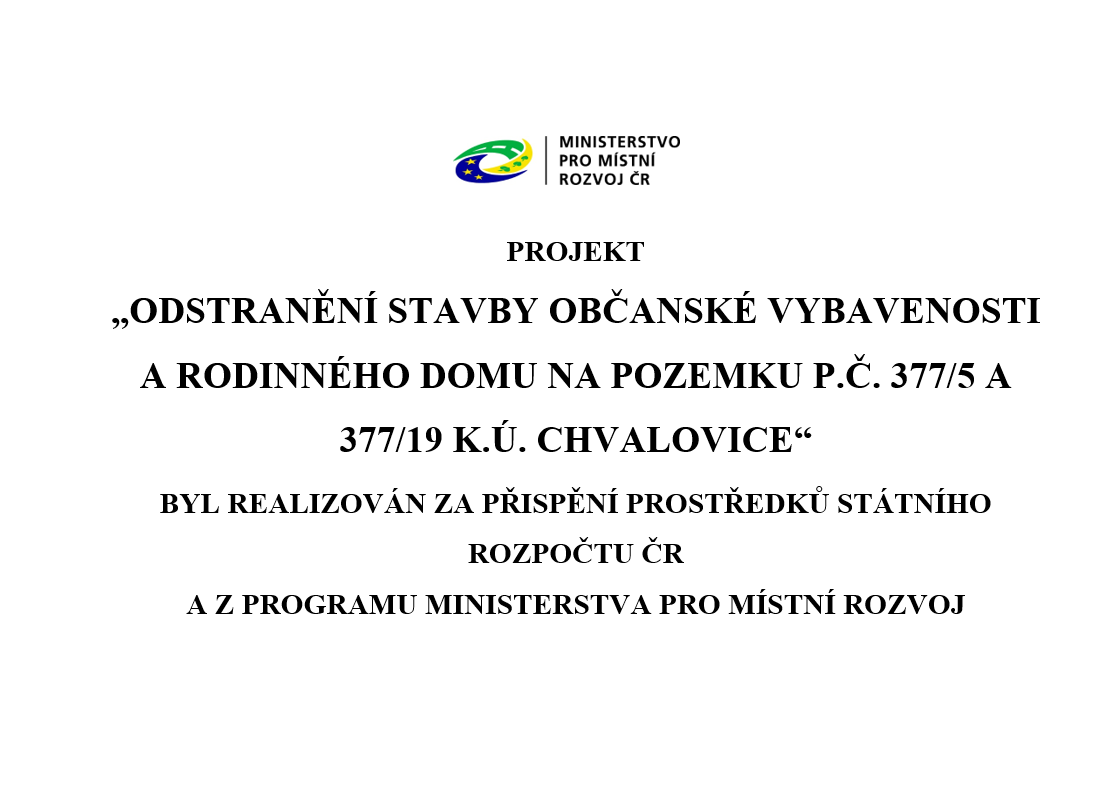 Obec Chvalovice oznamuje realizaci projektu na odstranění stavby občanské vybavenosti čp.175 a rodinného domu čp.176 na pozemku p. č. 377/5 a 377/19 v katastrálním území Chvalovice.