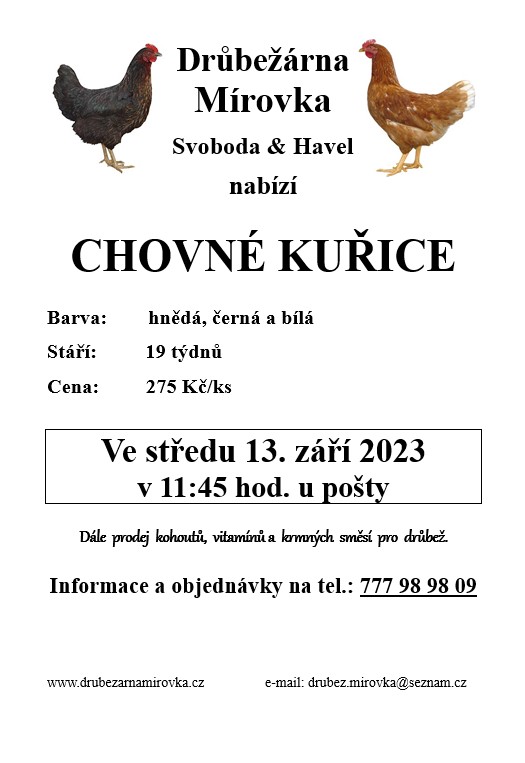 Prodej chovných kuřic dne 13.9.2023 (Drůbežárna Mírovka)