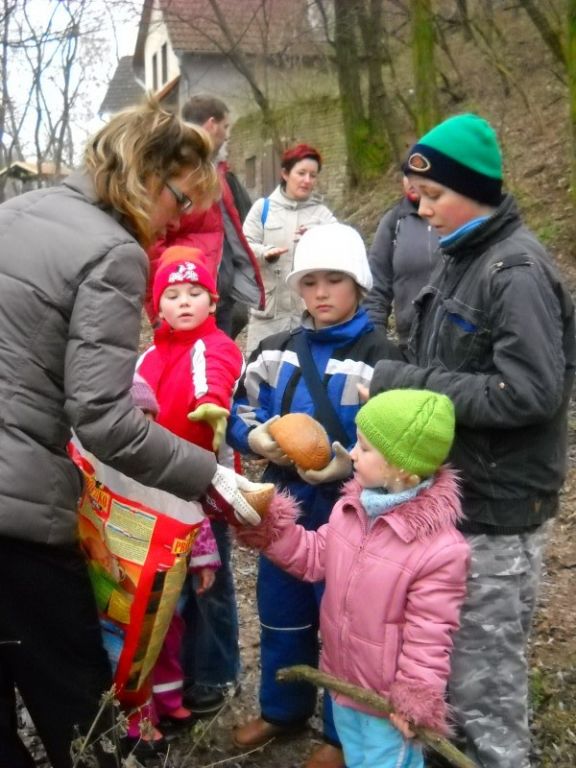 Myslivci s dětmi a jejich rodiči vyšli směrem k Šatovu, cestou doplnili zásoby krmení pro lesní zvěř a ptactvo.
