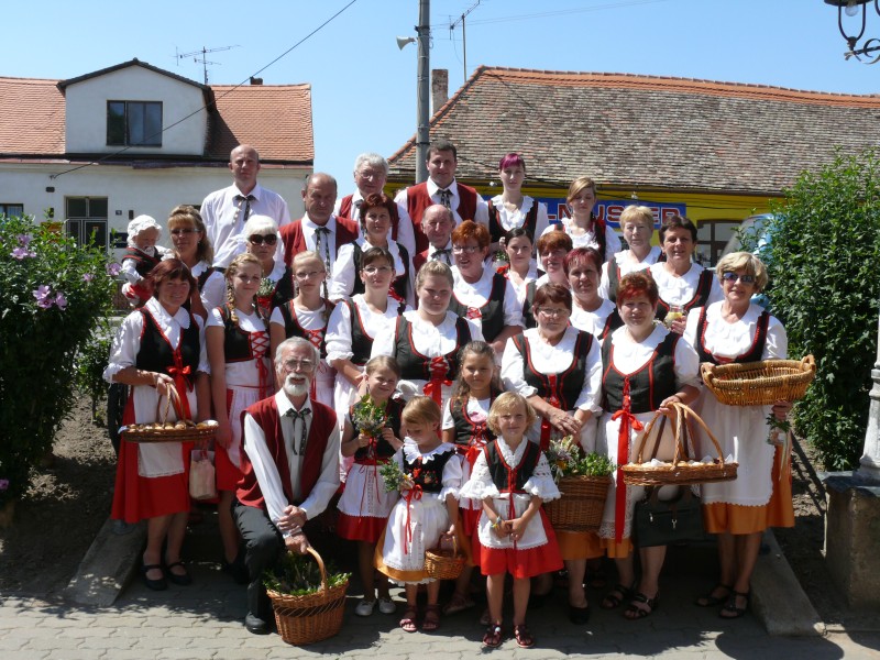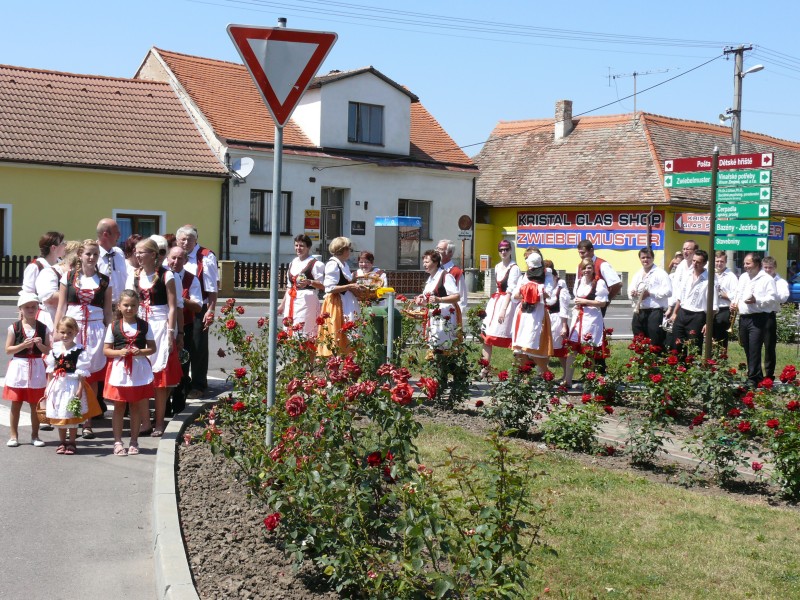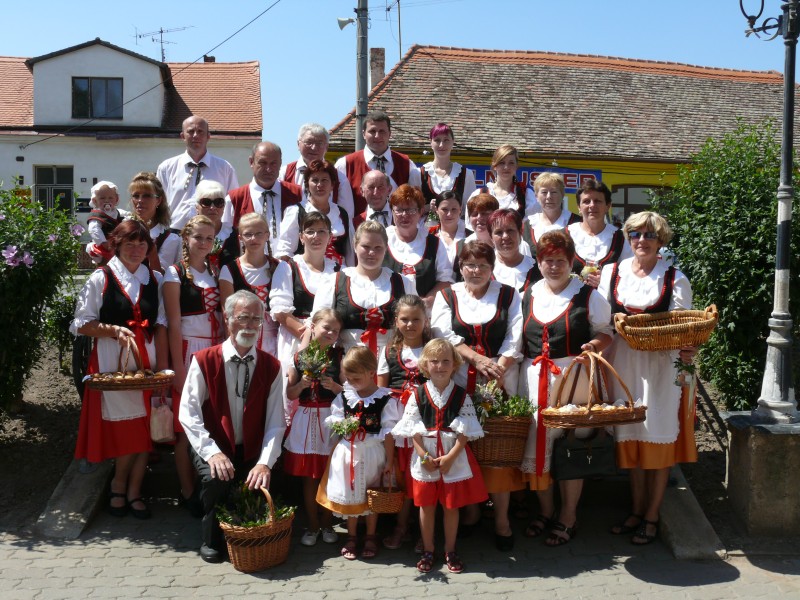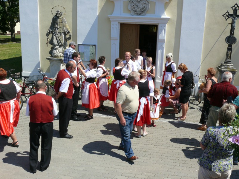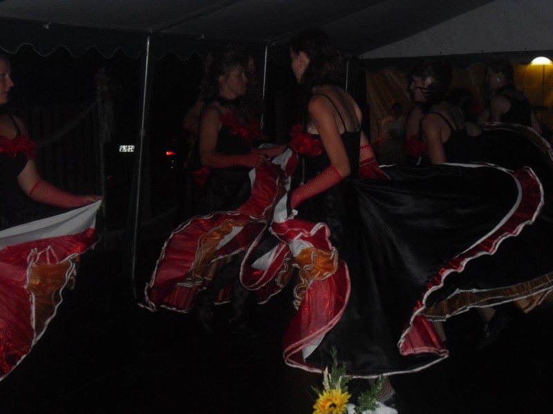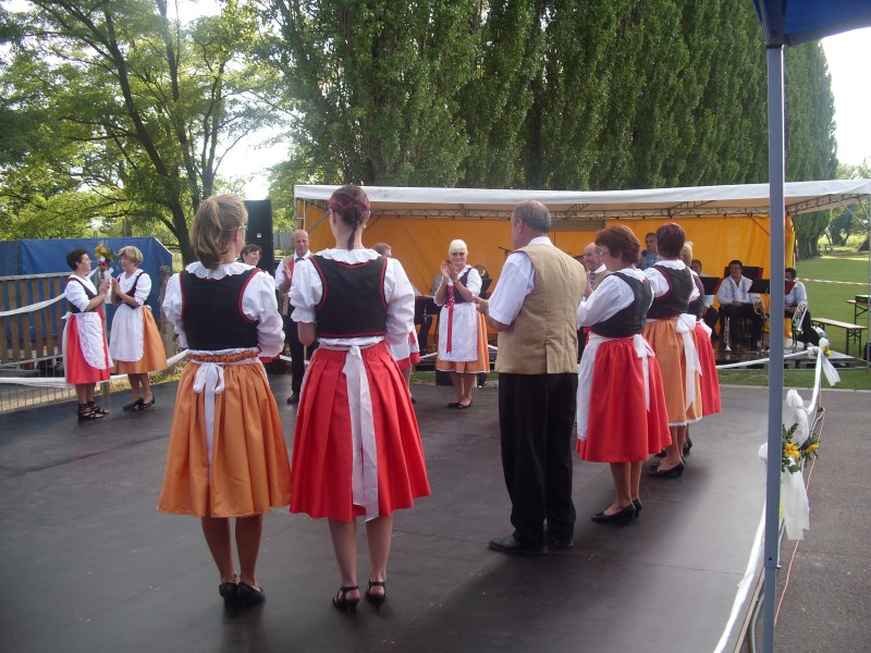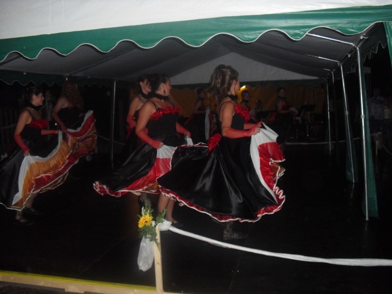 V podvečer pouťový program pokračoval ve sportovním areálu taneční zábavou, kterou novým předtančením uvedli Naši sousedé. Dobrou náladu si zúčastnění, kteří mohli vyzkoušet nový taneční parket, nenechali pokazit ani deštěm, ani hrozící bouřkou. Večer zpestřilo 9 kankánových tanečnic.