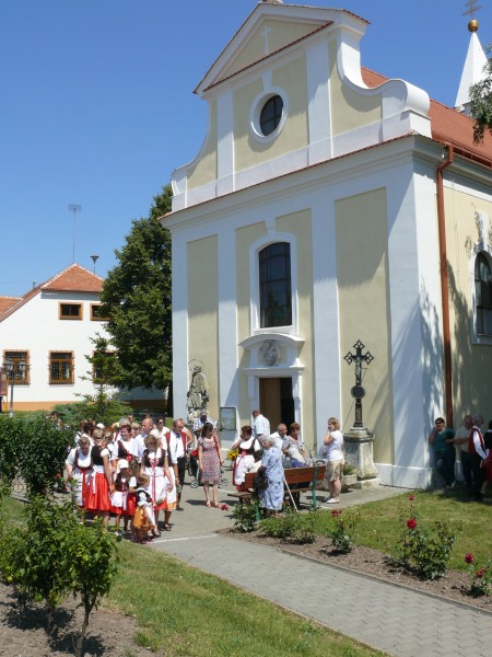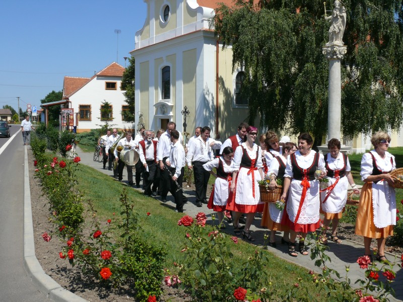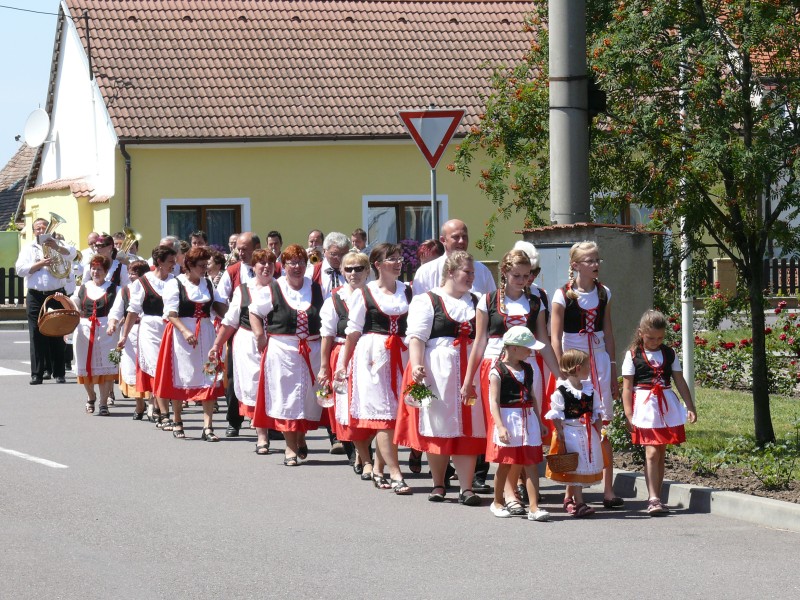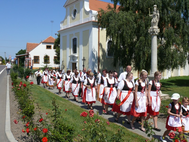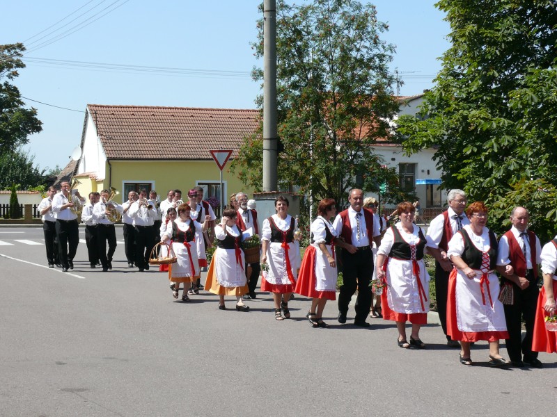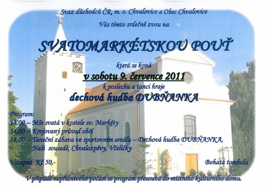 Poté zhruba tři desítky poutníků, členů kroužků pracujících při Svazu důchodců ČR, m. o. Chvalovice (Chvalozpěvy, Naši sousedé a Včeličky), za doprovodu Dechové hudby Dubňanka vyšly průvodem po obci. Jejich záměrem nebylo vybírat finanční příspěvek, ale přinést do domácností radost, kytičku a pouťový koláček.