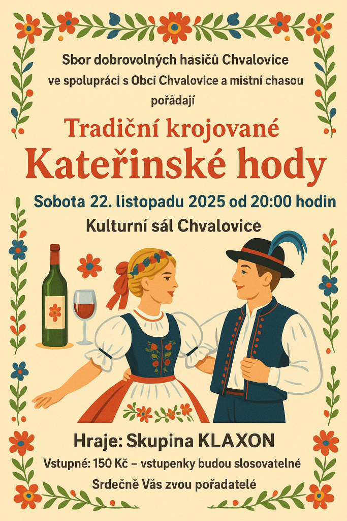 Večerní krojovaná zábavu od 20.00 hodin v KD Chvalovice za doprovodu hudební skupiny KLAXON.